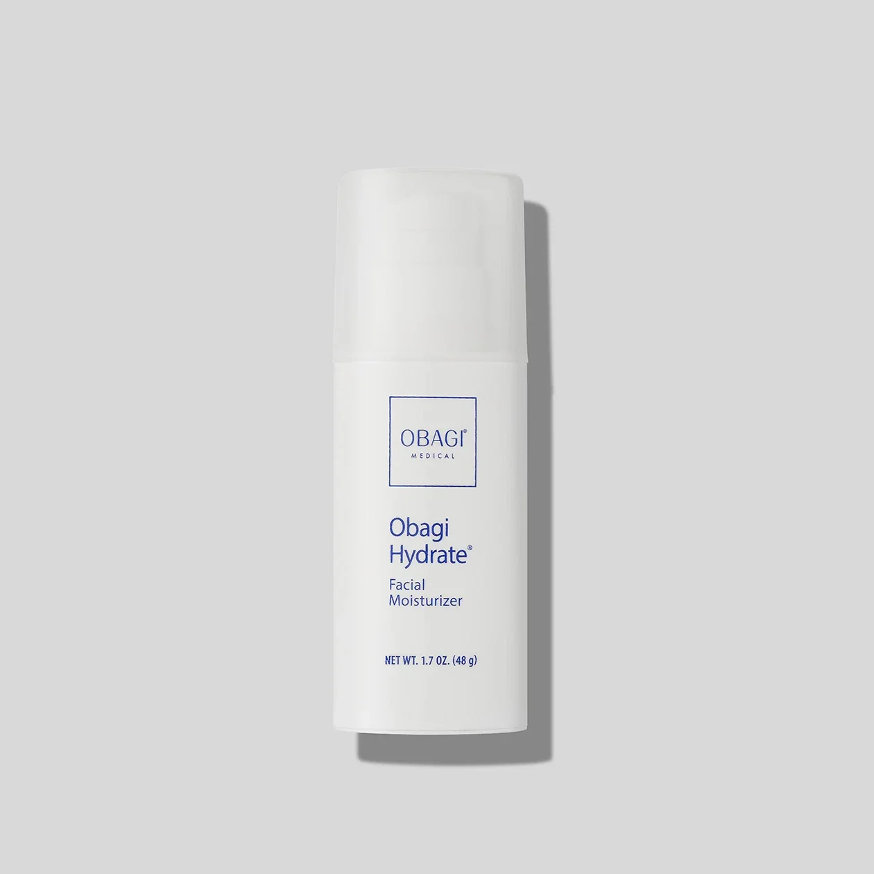 OBAGI HYDRATE®HYDRATE® FACIAL MOISTURIZERNon-comedogenic 8-hour Hydrating Face CreamDESCRIPTIONHydrate Facial Moisturizer is a lightweight facial moisturizer formulated with Tara Seed Extract, clinically proven to improve skin's moisture, and naturally derived ingredients, such as Shea Butter and Mango Butter, to further combat dryness. For long-lasting hydration and smoother-looking skin.INGREDIENTSAqua/water/eau, glycerin, caprylic/capric triglyceride, butyrospermum parkii (shea) butter, cyclopentasiloxane, glyceryl stearate, cetyl alcohol, dimethicone, saccharide isomerate, polysilicone-11, glycine soja(soybean) sterols, persea gratissima (avocado) oil, stearic acid, tetrahydrodiferuloylmethane, mangifera indica (mango) seed butter, hydrolyzed caesalpinia spinosa gum, caesalpinia spinosa gum, hydrolyzed, soybean fiber, panthenol, tocopherol, allantoin, bisabolol, sodium stearoyl glutamate, laureth-12, phenoxyethanol, ethylhexylglycerin, hexylene glycol, caprylyl glycol, carbomer, sodium hydroxide.